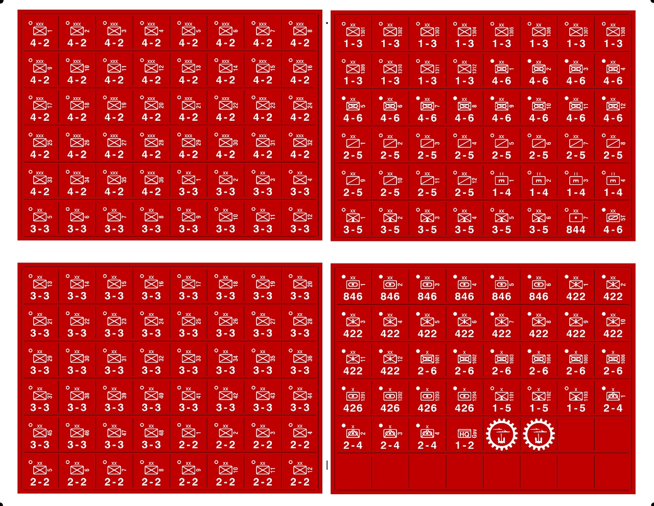 There are 18 double sided sheets in this "Mother of all Counter Sets". The major powers have a solid color background and white text, the minor countries have a two toned background with the two letter abbreviation for their country. Stripes across the NATO box indicate "Heavies" and you are supposed to make up some house rules for them. Marine units can also fall into this (or a similar group) if you like. Since the Yellow major power was so difficult to read, Black is the new Yellow - we think you will prefer them that way too.